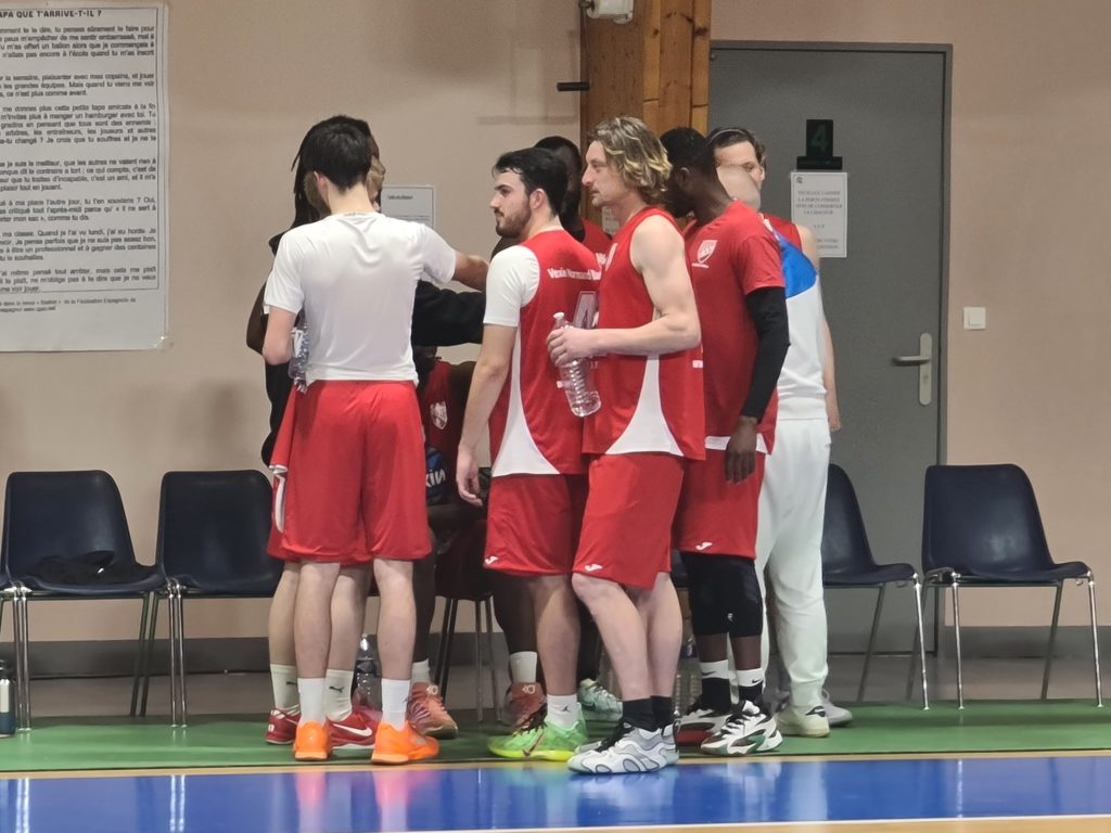 D’entrée les vexinois sont appliqués et concentrés, tout le contraire de la semaine dernière. La balle bouge bien et les garçons font parler leur passing game pour trouver le joueur ouvert. Comme par hasard l’adresse est au rendez-vous avec pas moins de 6 paniers extérieurs sur le quart temps, cela oblige rapidement les locaux à changer leur défense habituelle (22-18, 10′). Malgré cette bonne entame, les choses se gâtent dans le 2e quart, les locaux se rebiffent et montent en intensité défensive. Les vexinois sont en difficulté dans le jeu offensif en forçant trop les drives. Autre problème, la maîtrise du rebond, Rouxmesnil fait parler son avantage de taille pour s’offrir plusieurs chances par possession. Aidés par la salle, les locaux prennent les devants (35-38, 20′). Le moment clé est probablement dans le 3e quart, les visiteurs commencent à être acculés. Capitaine Ablaye doit rapidement écourter sa rencontre sur blessure. Les fautes s’accumulent également avec plusieurs sous la menace des fautes personnelles. A cela s’ajoute, une équipe locale dans son match qui profite de chaque erreur pour courir et marquer en transition. L’écart enfle dangereusement à -9 et l’on peut penser que les rouges vont lâcher face à tant d’adversité (54-63, 30′). A l’entame du dernier quart, les garçons sont mal embarqués mais rien n’est perdu pour autant. Dans ce moment charnière, les vexinois montrent de la solidarité, ils font le dos rond en provoquant des fautes et en scorant sur la ligne de réparation. Rouxmesnil se retrouve rapidement dans la pénalité avec plusieurs fautes rapides alors que le VNB peut encore en donner 4. Les feux sont donc au vert et l’espoir grandit rapidement. En attaque, les garçons trouvent systématiquement un duel favorable pour aller provoquer une faute ou marquer directement. De l’autre côté du terrain, c’est une démonstration d’abnégation et de courage, on voit évoluer la meilleure défense du championnat qui prend le pas sur la seconde. Dans le money time, les visiteurs réalisent le coup parfait en fermant bien les rebonds et surtout en exécutant parfaitement deux systèmes qui font filoches et 5 points dans la musette. Les locaux sont sonnés, ils ont vu le match se retourner complètement dans ce dernier quart alors que la victoire semblait s’offrir à eux, la deuxième fois en deux semaines pour eux. Côté VNB, c’est une « masterclass » de détermination et d’engagement notamment en finissant avec deux joueurs à 5 fautes et un blessé. Bravo à l’ensemble du groupe et au coach pour ce beau succès.